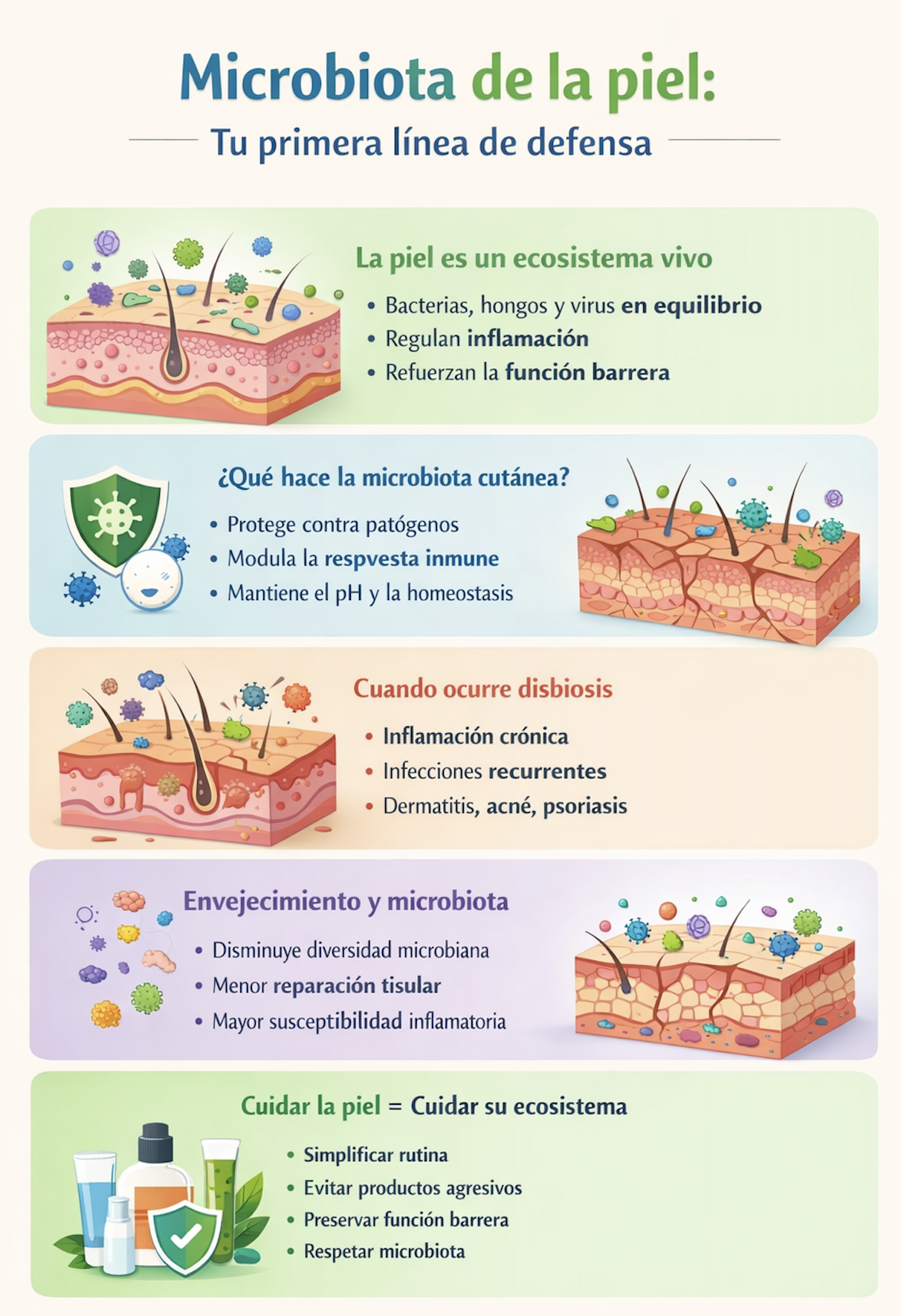 Hablar de microbiota de la piel no es una moda. Es reconocer que la salud cutánea depende del equilibrio entre barrera, inmunidad y microorganismos. Cuidar la piel implica proteger su ecosistema, no solo tratar sus síntomas.