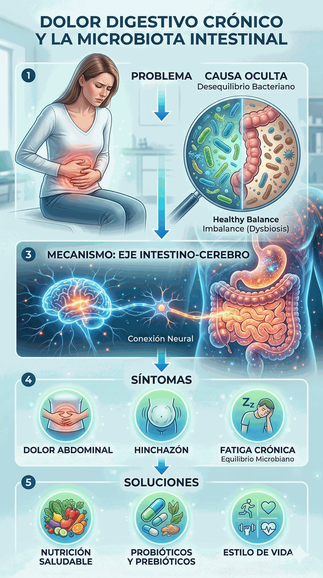 Hay un tipo de paciente que probablemente reconoces en consulta: lleva meses —o años— con molestias abdominales recurrentes, hábitos intestinales impredecibles y una fatiga que no mejora con el descanso. Los estudios convencionales vuelven "normales". No hay patología estructural evidente. Y sin embargo, el paciente sigue incómodo o en sufrimiento.