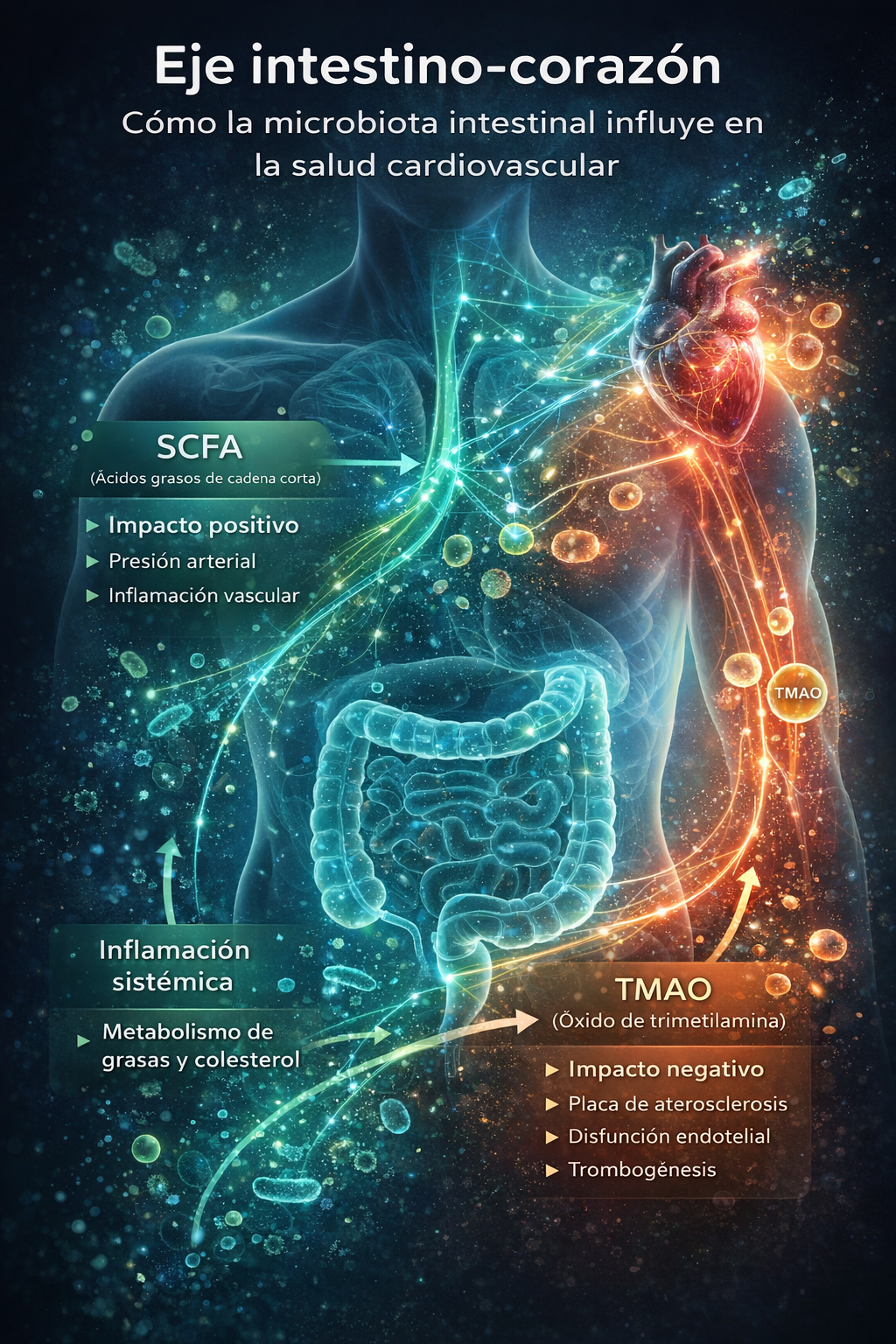 Imagina que tus bacterias intestinales son una fábrica química funcionando las 24 horas del día. Procesan todo lo que comemos y producen cientos de moléculas diferentes que entran al torrente sanguíneo y viajan por todo el cuerpo, incluyendo el corazón y arterias. Algunas de estas moléculas son protectoras, otras son dañinas, y el balance entre ambas puede marcar la diferencia entre salud y enfermedad.